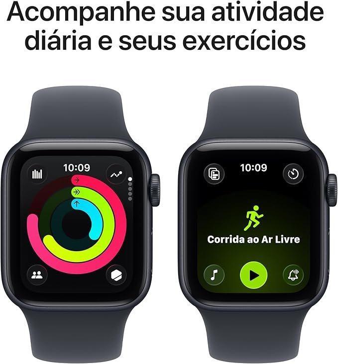 Equipado com recursos avançados de saúde, condicionamento físico e segurança, o Apple Watch SE 3 ajuda a monitorar frequência cardíaca, sono, atividades, corridas, exercícios e rotinas diárias com precisão e praticidade. O modelo também conta com GPS integrado, resistência à água de até 50 metros, conectividade sem fio, integração total com iPhone e bateria para até 18 horas de uso, sendo uma excelente opção para quem quer tecnologia confiável no pulso com o padrão Apple. A Apple também destaca vidro mais resistente e acabamento em alumínio reciclado, reforçando a proposta moderna e durável do modelo.