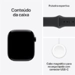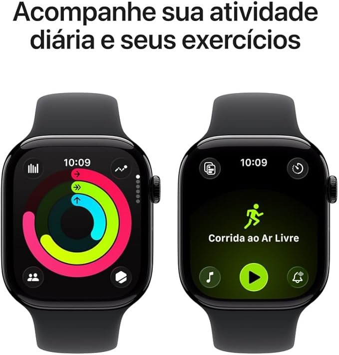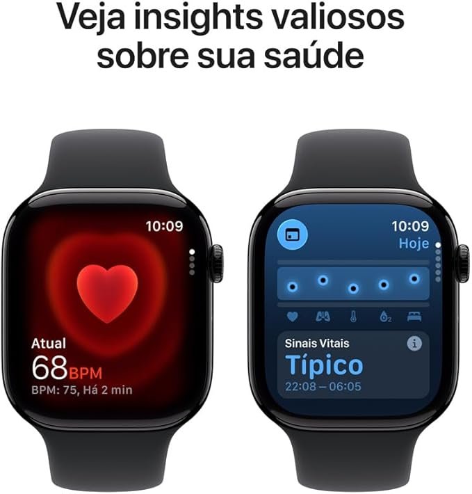 Além do design refinado, o modelo reúne recursos avançados de saúde e monitoramento corporal, incluindo acompanhamento cardíaco, monitoramento do sono, app ECG, notificações de frequência cardíaca alta e baixa, notificações de ritmo irregular, análise de sinais vitais e medição de oxigênio no sangue. Também traz GPS integrado para caminhadas, corridas, exercícios ao ar livre e rotinas esportivas com mais precisão. A Apple informa que a caixa de 46 mm mede 46 x 39 x 9,7 mm e pesa 37,8 g na versão alumínio GPS.