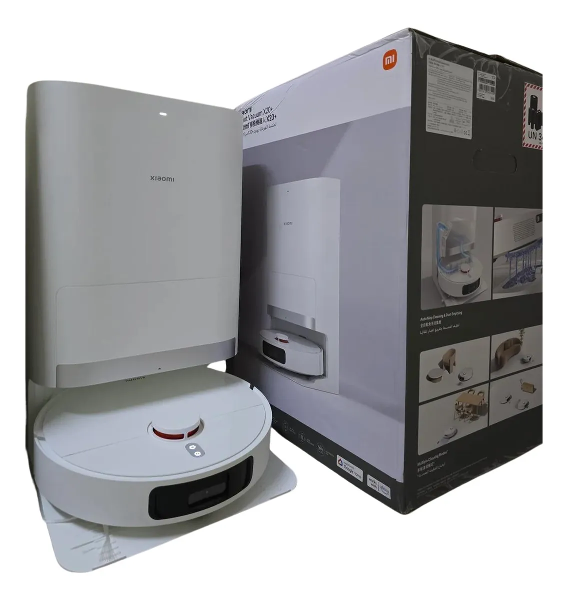 Aspirador robô: Dimensões do item: 350 × 350 × 97 milímetros Tensão nominal: 14,4 V Potência nominal: 75 W Peso líquido: 3,67 quilos Estação multifuncional: Dimensões do item: 586 × 427 × 340 milímetros Entrada nominal: 220-240 V 50/60 Hz Saída nominal: 20V 1A Potência (durante o esvaziamento da poeira): 1000W Potência (durante a limpeza): 30W Energia (secagem ao ar + carregamento): 30W Conteúdo da embalagem: Aspirador robótico. Estação tudo-em-um × 1 (bolsa descartável, tanque de água limpa, tanque de água suja, extensor de base de tábua de lavar, tábua de lavar incluída) Escova × 1 1 tampa de escova. Compartimento de pó ×1 (Filtro pré-instalado no compartimento de pó) 1 escova lateral. Conjunto de cabos × 1 2 suportes para esfregões. 2 esfregões (pré-instalados no suporte do esfregão) Manual do usuário ×1 Uma solução abrangente para economizar tempo e esforço Estação base inteligente tudo-em-um Coleta automática de poeira em 10 segundos. Lavagem automática de esfregões Tanque de água de grande capacidade de 4 litros. Bandeja removível para facilitar a limpeza Melhor desempenho de aspiração e limpeza. Potente esfregão rotativo de alta velocidade de 6000Pa Suction Elevador automático Evitação mais ágil de obstáculos. Sistema para evitar obstáculos com luz estruturada de área ampla S-Cross. Navegação a laser LDS Experiência interativa mais inteligente. Controle remoto com o aplicativo Mi Home/Xiaomi Home Controle de voz inteligente Com uma velocidade de rotação de 180 rpm, os esfregões atendem a todas as suas necessidades de limpeza de piso, removendo com eficácia manchas de café, sujeira, água e outros derramamentos nas áreas da sala de estar e da cozinha. Equipado com o sistema S-Cross para evitar obstáculos de luz estruturada de área ampla, o vácuo pode detectar e evitar obstáculos baixos com uma percepção de grande angular, mesmo em condições de pouca luz. O sistema de navegação a laser LDS cria uma varredura precisa de 360 graus do ambiente interno, criando rapidamente um design detalhado da casa. Com um planejamento inteligente, a rota de limpeza é otimizada para uma limpeza profunda e altamente eficiente. Controle o aspirador remotamente e personalize a limpeza com o aplicativo Xiaomi Home/Mi Home Mesmo quando estiver fora de casa, você pode controlá-lo remotamente. Diga a ele para limpar o chão da sala, quarto ou cozinha com apenas um clique no aplicativo Xiaomi Home/Mi Home e comece a aspirar e esfregar imediatamente. Aviso legal • A duração da bateria depende de como você usa o produto.